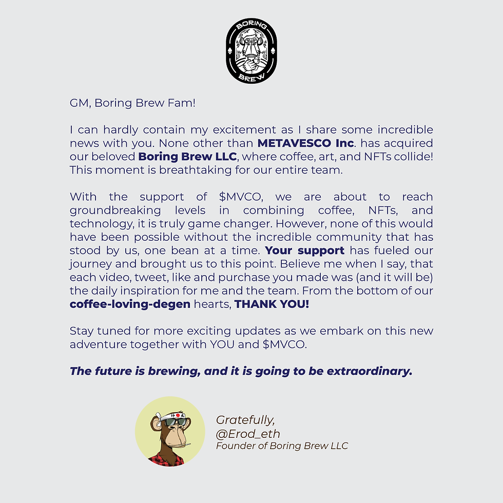 "I can hardly contain my excitement as I share some incredible news with you. None other than Metavesco Inc has acquired our beloved Boring Brew LLC, where coffee, art, and NFTs collide,” Boring Brew Founder Erod.Eth wrote in an announcement on Twitter earlier today. This moment is breathtaking for our entire team. With the support of MVCO, we are about to reach groundbreaking levels in combining coffee, NFTs, and technology. It’s truly a game changer.”