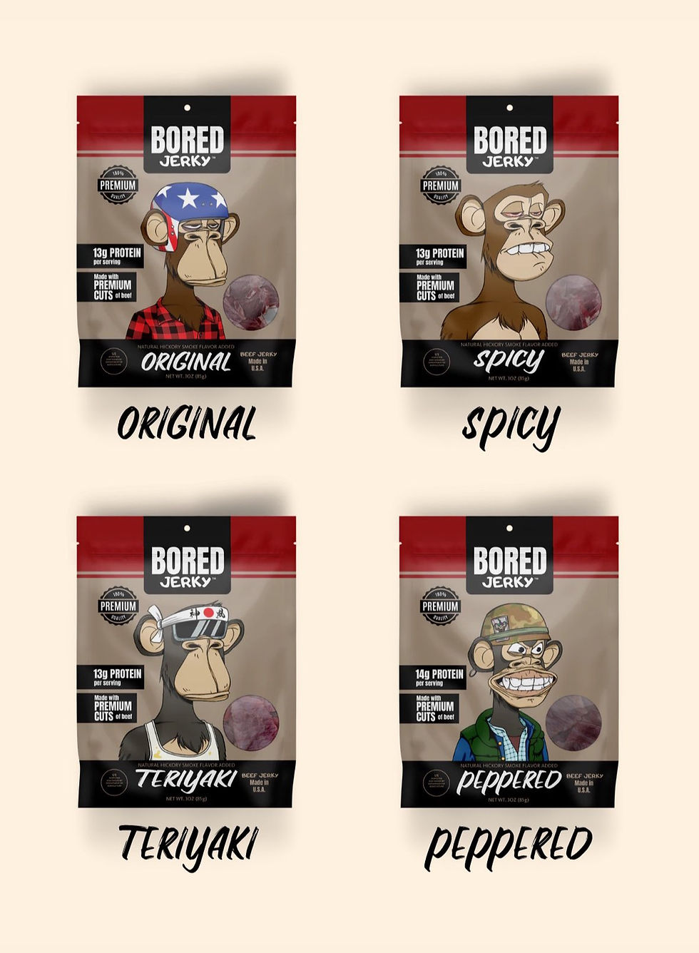 After you roll up your first blunt and partake in tomorrow’s high holiday festivities, make sure to head on over to Amazon and order an original, spicy, teriyaki, or peppered flavored bag of Nelk Boys’ Bored Jerky; each featuring a different Bored Ape on its packaging!
