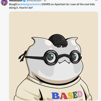 Designer Toshiro’s DSNRS have clearly struck a chord with $Apes and Apes alike. The project features 89 unique outfit designs, 56 types of frogs, and a host of other traits that have the community croaking with excitement. All this variety has holders sharing their handsome little guys all over the timeline!