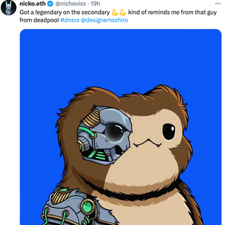 “The mint and reveal of @designertoshiro DNSRS collection was incredible,” LunchRun tweeted. “It brought back so good memories of the 2022 NFT craze. These frogs are irresistible. So glad to be part of the community and looking forward to invest myself in this promising NFT project! Do (Frog emoji) follow(Frog emoji)?”