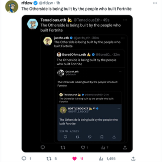To highlight Seavers past experience with Fortnite and to celebrate him joining the swamp, Apes and Yuga Labs asset holders started a copy pasta inception chain where they would screenshot user's “The Otherside is being built by the people who built Fortnite,” Tweets and then post the screenshot along with their own “The Otherside is being built by the people who built Fortnite,” tweet over and over again!
